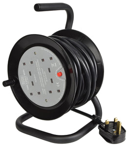 Tough and durable mains extension cable reels with 4 mains sockets and fitted with a 13A fused mains plug. Fitted to a sturdy steel frame and carry handle ensuring the reel is stable when in use, but easy to carry around.