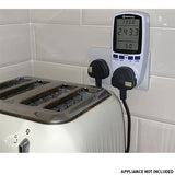 Plug through UK power meter that measures electricity usage and calculates the running costs of household appliances. The large easy to read display indicates current usage in Watts, Amps, Volts or KWh and also provides an indication of your electricity costs after you have entered your tariff details. The unit also incorporates overload protection and has an inbuilt rechargeable battery to save your settings and data during a power failure.
