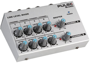 The Pulse MLX402 is compact mixer with 8 High impedance mono inputs designed to balance the input from 8 Line inputs and adjust the outputs volume for a recording device or amplifier.